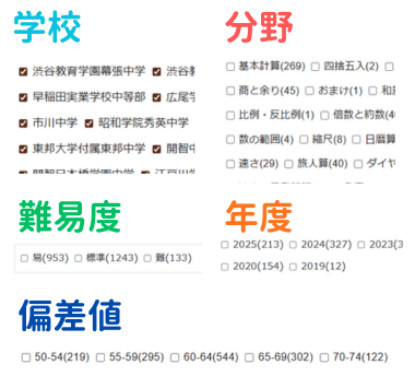 学校単位の絞り込みはもちろん、分野・難易度・年度・偏差値など、学習目的に合わせて自由に問題を選んで印刷・ダウンロードできます。