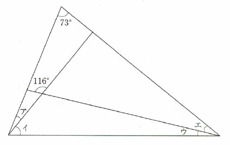 次の図で、角アの大きさと角イの大きさの比は1 : 3、角ウの大きさと角エの大きさの比は1 : 2です。角アの大きさと角ウの大きさをそれぞれ求めなさい。
