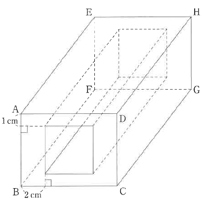 図のように、AB=6cm、AD=8cm、AE=12cmの直方体ABCD-EFGHから、1辺の長さが4cmである正方形を底面とする直方体でまっすぐ奥までくりぬいた立体があります。次の問いに答えなさい。