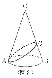 引用元:清風中学校 2025年度入学試験問題 算数 問4<図3>のように、円すいの側面に沿って長さが最も短くなるようにひもをかけ、Aでとめます。また、ひもがOBと交わる点をCとします。