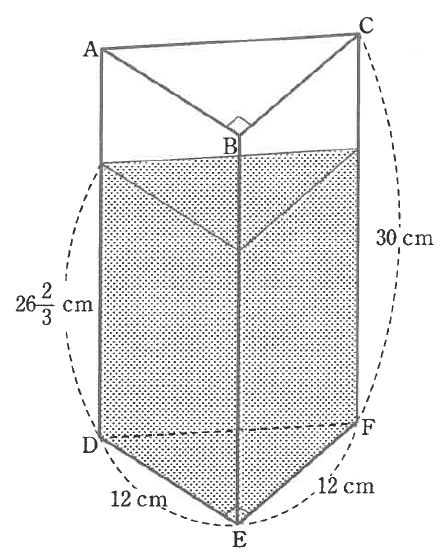 次の図のような底面が直角二等辺三角形であるふたのついた三角柱の容器があり、中に水が入っている。この容器を、三角形DEFの面を底にして水平に置いたところ、水面の高さが\( \displaystyle 26\frac{2}{3} \)​cmになった。このとき、次の問いに答えなさい。