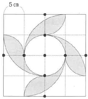 1辺の長さが5cmの正方形の紙を16枚組み合わせて大きな正方形を作り、次の図のように円周の一部をかきました。●は円の中心を表します。次の問いに答えなさい。ただし、円周率は3.14とします。