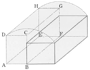 次の図のように、AB=3cm、AD=4cm、AC=5cm、AE10cmの直方体ABCD-EFGHを直線BFを軸として90°回転させてできる立体(次の図の影の部分の立体)の体積を答えなさい。ただし、円周率は3.14とします。