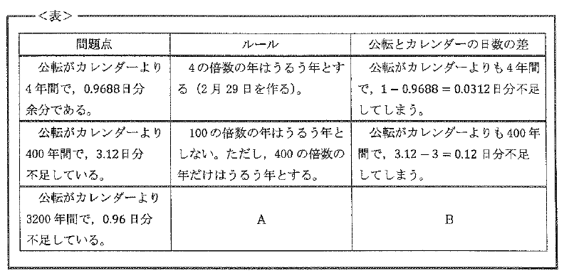 (5)表の空欄Bには、(4)で答えたルールによる公転とカレンダーの日数の差についての説明が入ります。表の中の他の部分の説明を参考にしながら、空欄Bに入る文章を答えなさい