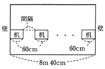 引用元:獨協中学校 2021年度入学試験問題(第1回) 算数 問1-(5)次の図のような横幅が8m40cmの教室に、7個の机を横一列に等間隔に並べます。机の横幅が60cmで両はじの机を壁につけるとき、机と机の間隔は何cmにすればよいですか。