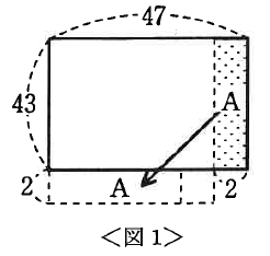 先生 : 「うん。<図1>で43×47の長方形の面積を考えよう。Aの部分を切り取って、長方形の下につけると、長方形の面積は45×45の正方形から、ア×アの正方形をひけばいいことがわかるよね?」