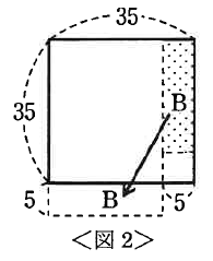 先生 : 「まぁね。どういうふうに考えるかというと、例えば<図2>のような35×35の正方形で、Bの部分を切り取って、正方形の下にくっつけてみよう。そうすると、40×イの長方形と5×5の正方形をたせばいいということがわかるよね?」