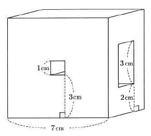 1辺の長さが7cmの立方体があります。図のように、正面と横の面からそれぞれの面の反対側まで正方形の穴をあけました。残った立体の体積は何cm3ですか。