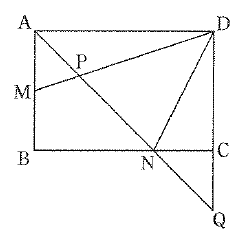 次の図のような、長方形ABCDがあります。AB=8cm、BC=12cmで、ABのまん中の点をMとします。また辺BC上に点Nをとると、BN : NC = 2 : 1となります。さらに辺ANと辺MDの交わる点をP、ANをNの方に延長した直線と、辺DCをCの方に延長した直線の交わる点をQとします。このとき、次の問いに答えなさい。