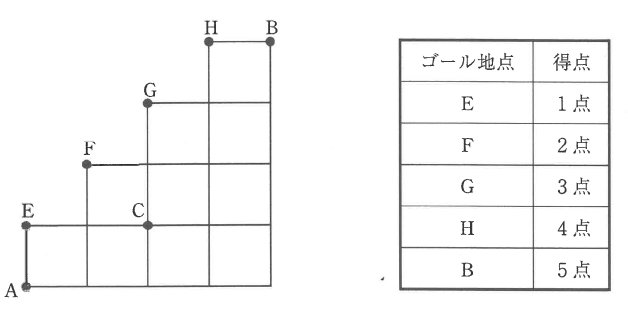 次の図のように道が通っています。点Aからスタートし、道に沿って右方向か上方向のどちらかに進むことを繰り返していき、点E、F、G、H、Bのいずれかの地点に到達したときに移動をやめ、到達した地点をゴールとします。また、ゴールの位置に応じて得点が与えられるものとし、その内訳は以下の表のとおりとします。ただし、途中で点Cを通った場合にはゴールした際に与えられる得点から2点引きます。例えば点Aをスタートし、点Cを通って点Bに到達した場合の得点は3点です。このとき、次の問いに答えなさい。