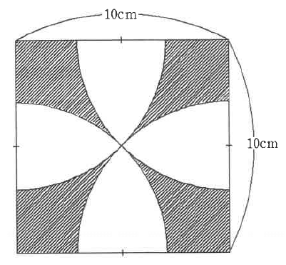 引用元:広尾学園中学校 2024年度入学試験問題(第1回) 算数 問1-(5)次の図は、正方形の中に同じ大きさの四分円を4つかいた図です。斜線部分の面積を求めなさい。ただし、円周率は3.14とします