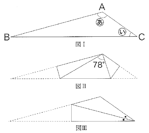 図Ⅰのような三角形ABCがあります。三角形ABCの頂点B、Cが頂点Aと重なるように折ると図Ⅱのようになり、頂点Bが頂点Cと重なるように折ると図Ⅲのようになりました。図Ⅲで同じ印をつけた角の大きさは等しいことを表しています。