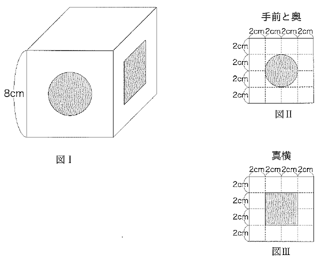 1辺の長さが8cmの立方体から、図Ⅰのように直方体を横の面から反対の面までくり抜き、円柱を手前の面から反対の面までくり抜き、立体を作りました。図Ⅱはこの立体を手前の面と奥の面から見たもので、図Ⅲは真横から見たものです。