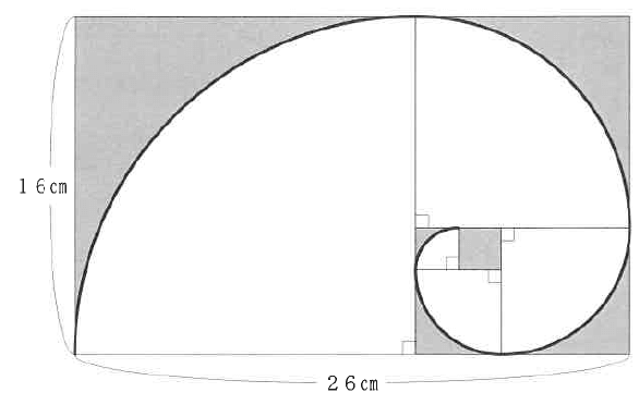 次の図のように、長方形の白い画用紙に中心角が90°のおうぎ形を5つかき、色をぬりました。太線はそのおうぎ形の弧の部分です。