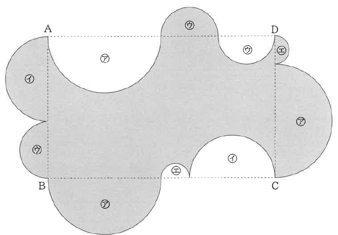 次の図の長方形ABCDは、縦20cm、横32cmです。また、ア~エは半円で、同じ記号の半円の半径は等しく、ウとエの半径の比は2 : 1です。
