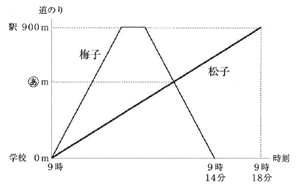 引用元:十文字中学校 2021年度入学試験問題(第1回) 算数 問5梅子さんは9時に学校を出発し、一定の速さで巣鴨駅まで走りました。駅で2分間休憩し、同じ道のりを同じ速さで走って学校まで戻ってきました。松子さんも9時に出発し、梅子さんと同じ道のりを一定の速さで駅まで歩きました。次の図は、そのときの時刻と道のりの関係を表したものです。次の問いに答えなさい。