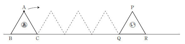 1辺の長さが5cmの正三角形ABCがあの位置からすべらないように回転しながら、いの位置まで移動します。このとき、次の問いに答えなさい。