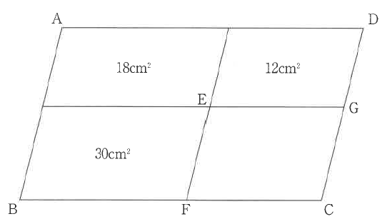 次の図のように平行四辺形ABCDを4つの平行四辺形に分けました。このとき、平行四辺形EFCGの面積は何cm2か答えなさい。