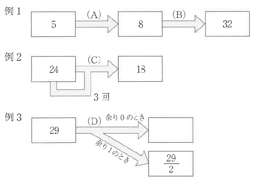 (4)⑤と⑥に入る計算の指示を入れ替えても⓻は同じ数になるとき、⓻に入るもっとも小さい数を答えなさい。ただし、⑤と⑥には異なる計算の指示が入ることとします。
