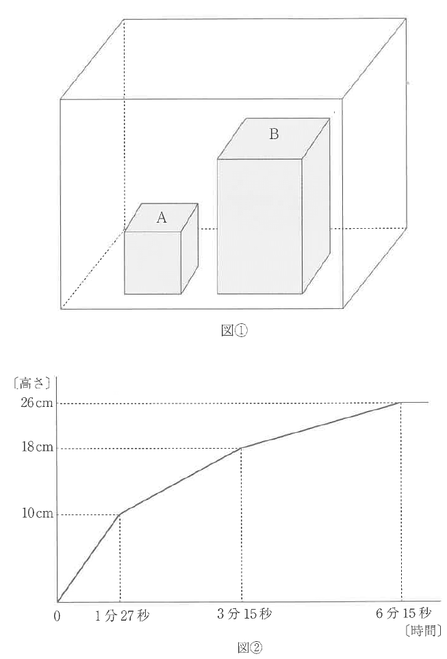 図①のように、水槽の中に鉄でできた二つの四角柱A、Bがあります。この水槽に毎秒20cm3の割合で水を注ぎます。図②のグラフは水槽に水を注ぎ始めてからの時間と水面の高さの関係を表したものです。このとき、次の問いに答えなさい。