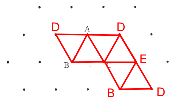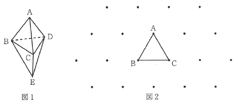 図1のように正三角形6つでできている立体があります。図2には、図1の立体の辺AD、BC、BD、DEを切ったときにできる展開図の一部がかいてあります。展開図の残りと頂点の記号をかきなさい。