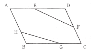 次の図のような平行四辺形ABCDがあります。AE : ED = 3 : 5、DF : FC = 3 : 2、BG : GC = 7 : 5、AH : HB = 2 : 1です。三角形HBGの面積が14cm2のとき、六角形AHGCFEの面積を求めなさい。