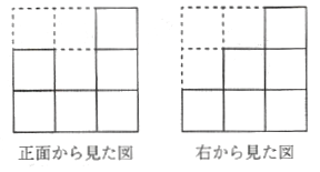 同じ大きさの立方体がたくさんあります。この立方体の何個かを、面と面がぴったり重なるようにのりではり合わせて立体を作りました。この立体を正面と右の2方向から見ると、次の図のようになりました。このとき使っている立方体の数として考えられる最大の数は14個です。では、最小の数はいくつですか。