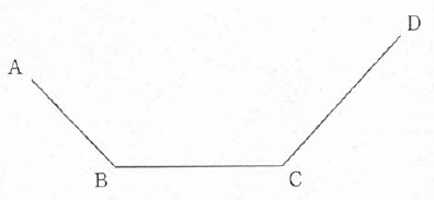 次の図のようにA、B、C、Dの4つの地点を通る道があります。A地点、D地点はB地点、C地点よりA高台にあり、BC間は平地です。太郎君はA地点からD地点へ、次郎君はD地点からA地点へ向かって同時に出発し、次郎君がA地点に到着してから10分後に太郎君がD地点に到着しました。2人とも、下りは時速6km、平地は時速5km、上りは時速4kmの速さで進み、途中の休憩はありません。
