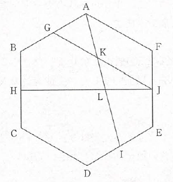 引用元:慶應義塾普通部校 2021年度入学試験問題(第1回) 算数 問9正六角形ABCDEFの辺AB、BC、DE、EFの真ん中の点をそれぞれG、H、I、Jとし、AIとGJ、HJが交わる点をそれぞれK、Lとします。このとき、AK : KL : LIを最も簡単な整数の比で求めなさい。