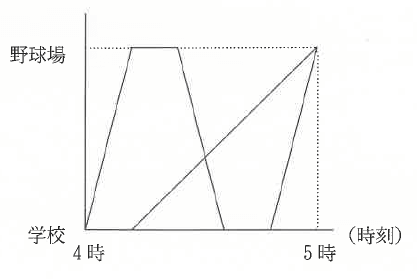 学校と野球場の間をバスが往復しています。バスは学校と野球場にそれぞれ到着したとき、そこで12分間停車します。ある日、たろう君は、午後4時12分に学校を出発して、自転車で野球場に向かったところ、午後5時に野球場に着きました。次のグラフは、学校を午後4時に出発するバスとたろう君が自転車で走行する様子を表したものです。ただし、バスと自転車の速さは、それぞれ一定とします。