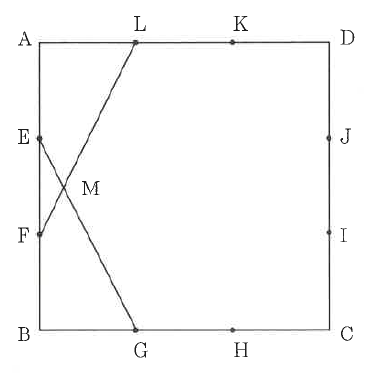 引用元:佼成学園中学校 2023年度入学試験問題(第1回) 算数 問5次の図のような、1辺の長さが30cmの正方形ABCDがあります。E、F、G、H、I、J、K、Lは各辺を3等分した点です。EGとFLの交点をMとします。