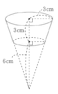 引用元:佼成学園中学校 2024年度入学試験問題(第1回) 算数 問2-(6)次の図のように、大きな円すいから小さな円すいを切りとった立体の体積は cm3です。ただし、円すいの体積は「(底面積)×(高さ)×\( \displaystyle \frac{1}{3} \)」で求めることができます。