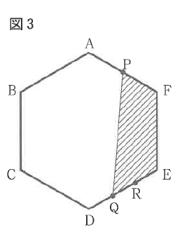 引用元:佼成学園中学校 2025年度入学試験問題(第1回) 算数 問5(3)図3のように、AFを2等分する点をPとして、DEを3等分する点をQとRとします。図3の斜線部分の面積は何cm2ですか。