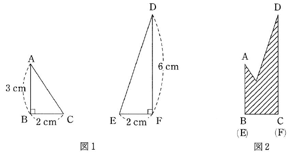 図1のような三角形ABCと三角形DEFがあります。図2は2つの三角形の辺BCと辺EFをぴったりと重ねた図形です。このとき、図2の図形の斜線部分の面積を求めなさい。
