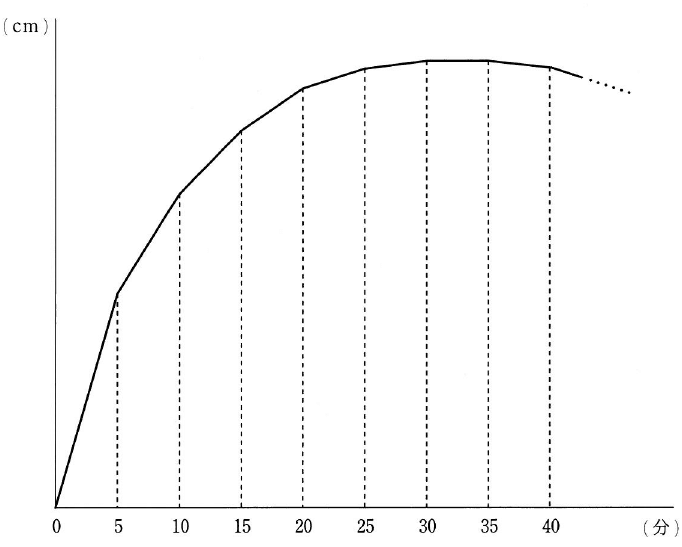 ②排水管Aだけを開いた状態で、空の水槽に水を入れ、水を入れ始めてから5分が経過するごとに排水管Bを1本ずつ開いた場合、水面の高さは次のグラフのように変化します。ただし、30分から35分までの5分間、水面の高さは変化しません。