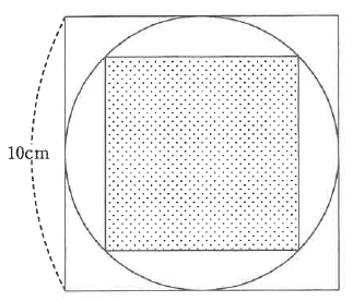 引用元:三田国際科学学園中学校 2025年度入学試験問題(第1回) 算数 問1-(4)次の図のように、1辺の長さが10cmの正方形の内側にぴったりと入る円があり、その円の内側に正方形が入っています。色を付けた正方形の面積は cm2です。