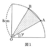 (1)次の図1のような半径8cm、中心角が直角であるおうぎ形があり、点A、Bはおうぎ形の曲線部分を3等分する点です。