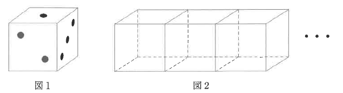 図1のさいころをいくつか使い、同じ目の数の面どうしをはり合わせて図2のように一直線に並べます。次の問いに答えなさい。ただし、さいころの向かい合う面の目の数の和は7であるものとします。
