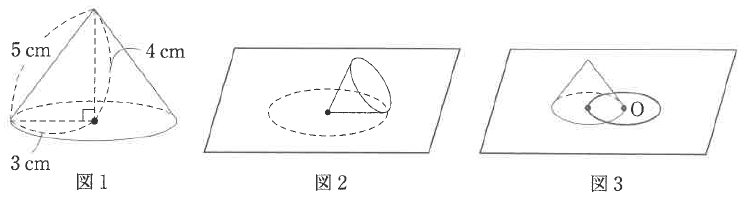 図1のような、底面の半径が3cm、高さが4cm、母線が5cmの円すいがあります。次の問いに答えなさい。ただし、円すいの体積は(底面積)×(高さ)÷3で求めるものとします。