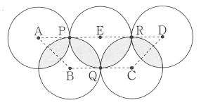 次の図のように、半径の長さが等しい円を点P、Q、Rで3つの円が1点で交わるように5つ並べたところ、それぞれの円の中心を結んでできた四角形ABCDはADとBCが平行な台形で、その面積は48cm2でした。このとき、色がついた部分の面積の合計は cm2になります。ただし、円周率は3.14とします。