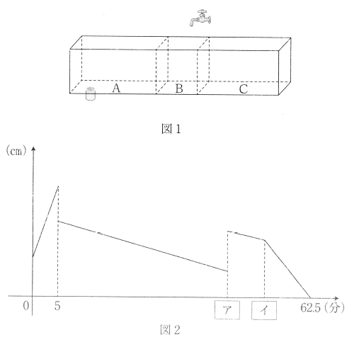 図1のような直方体の水そうに仕切りが2つあり、左からA、B、Cに分かれています。Aの底面積は150cm2、Bの底面積は75cm2、Cの底面積は120cm2です。最初、Aには水そうの高さの\( \displaystyle \frac{3}{5} \)​まで、Bには水そうの高さの\( \displaystyle \frac{1}{4} \)​まで、Cには水そうの高さの\( \displaystyle \frac{5}{8} \)​まで水が入っています。ある時刻からBに水を毎分300cm3ずつ注ぎ、同時にAから水を毎分360cm3ずつ排水します。Bの水位が水そうの高さの\( \displaystyle \frac{3}{4} \)​になるとAとの間の仕切りがなくなり、Bの水位が水そうの高さの\( \displaystyle \frac{1}{5} \)​になると、Cとの間の仕切りがなくなります。また、すべての仕切りがなくなってからしばらくして、Bに水を注ぐのを止めました。図2はBの水位と時間の関係をグラフで表したものです。ただし、水そうの高さと仕切りの高さは同じです。このとき、次の問いに答えなさい。