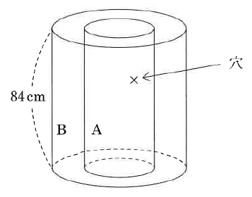 高さが84cmの2つの円柱の容器ア、イがあります。アとイの底面の半径はそれぞれ5cmと10cmです。下の図のように、イの中にアを底面がぴったり重なるように入れます。アの内側の部分をA、イの内側でアの外側の部分をBとします。Aを水で満たしてから、アの側面に穴を1つ開けたところ、AとBの水面の高さの比が4 : 1になりました。ただし、容器の厚みと穴の大きさは考えないものとします。