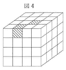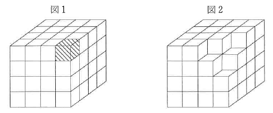 1辺の長さが1cmの立方体を64個積み重ねて、1辺の長さが4cmの立方体を作ります。色がぬられた立方体がある場合は、色がぬられた立方体と、それととなり合う立方体を取り除きます。例えば、図1のように色がぬられた立方体が1つあるときは、図2のように4つの立方体を取り除いた立体ができます。