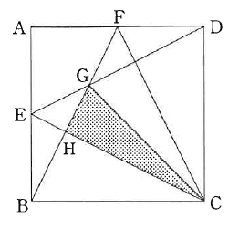 次の図のような面積が30cm2の正方形ABCDがあります。E、Fはそれぞれ辺AB、ADのちょうどまん中の点です。また、BFとDEの交わった点をG、BFとCEの交わった点をHとします。
