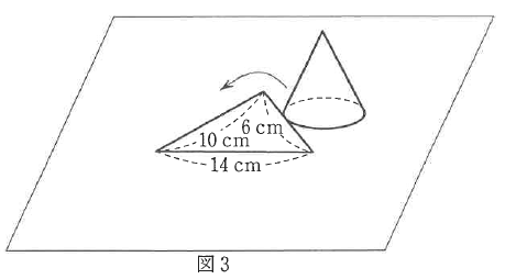 ③図3のように、台の上に三角形があります。円すいを三角形の外側を辺にそって1周させました。このとき、円すいが通過した部分の体積を求めなさい。