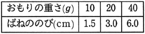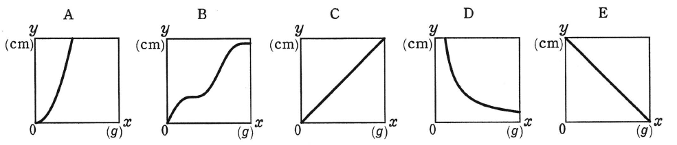 実験結果から、ばねにつるしたおもりの重さをxg、そのときのばねののびをycmとすると、xとyの関係をグラフで表したものはイとなる。