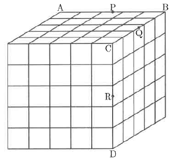同じ大きさの小さい立方体の積み木125個を積んで図のように大きい立方体をつくりました。図において、PはAB、QはBC、RはCDのそれぞれ真ん中の点です。P、Q、Rを通る平面で大きい立方体を切断しました。このとき、次の問いに答えなさい。