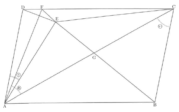図の四角形ABCDは、BC=5cmの平行四辺形です。CD上に点Fをとり、AFを折り目として三角形AFDを折り返すと三角形AFEとなりました。ACとBEの交わる点をGとします。このとき、角FAG(図のあ)の大きさが45°、角ACB(図のい)の大きさが60°となりました。