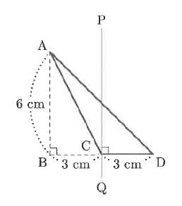 次の図で、ABとPQはどちらもBDと垂直です。三角形ACDをPQのまわりに1回転させたときにできる立体の体積を求めなさい。円すいの体積は(底面積)×(高さ)÷3で求められます。