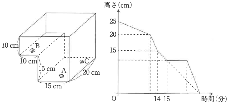 図のような水が満杯に入った容器があります。はじめ、排水栓Aから毎分250mLずつ水を抜き、途中で排水栓Bからも水を抜きました。排水栓Aから水を抜き始めて15分後に排水栓Aを閉じ、その7分後に排水栓Cから水を抜いたところ、排水栓Aを閉じず、排水栓Cを開けなかったときに空になる予定だった時間にちょうど空になりました。次のグラフは容器が空になるまでの時間と底面からの高さの関係を表したものです。このとき、次の問いに答えなさい。